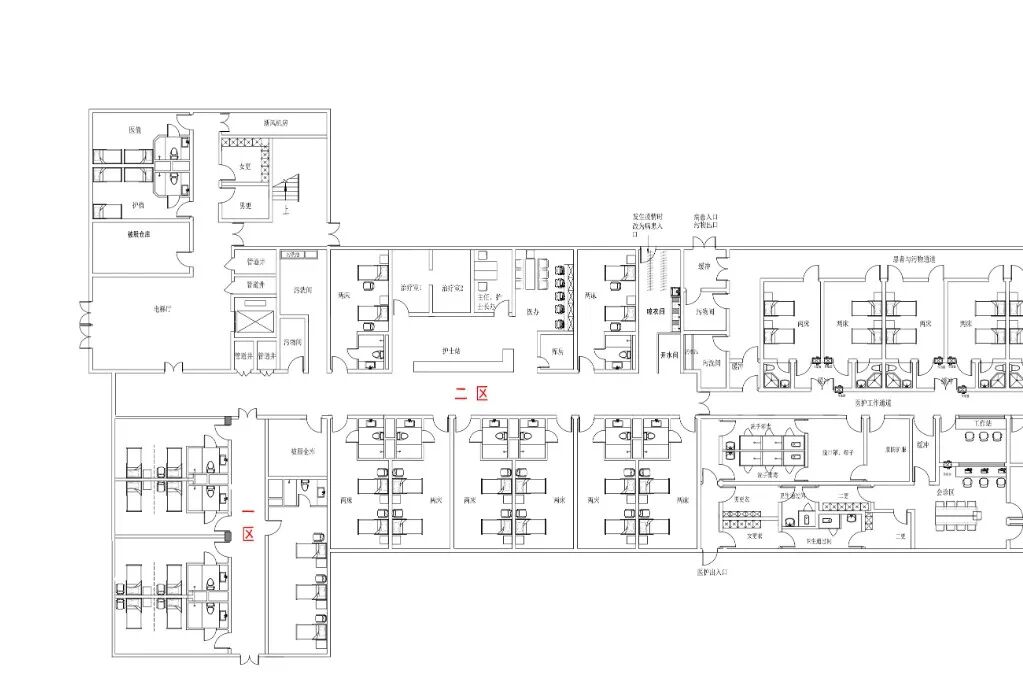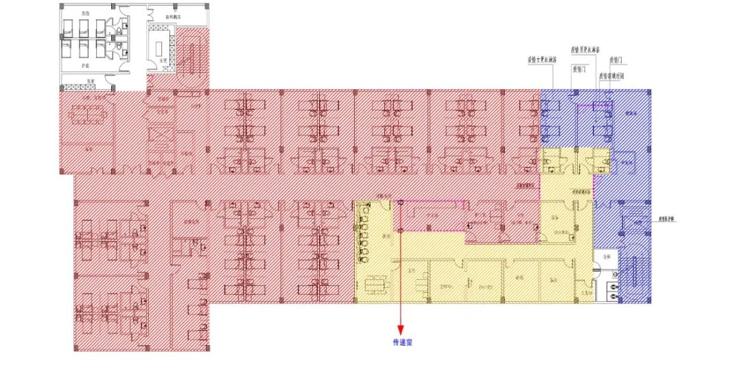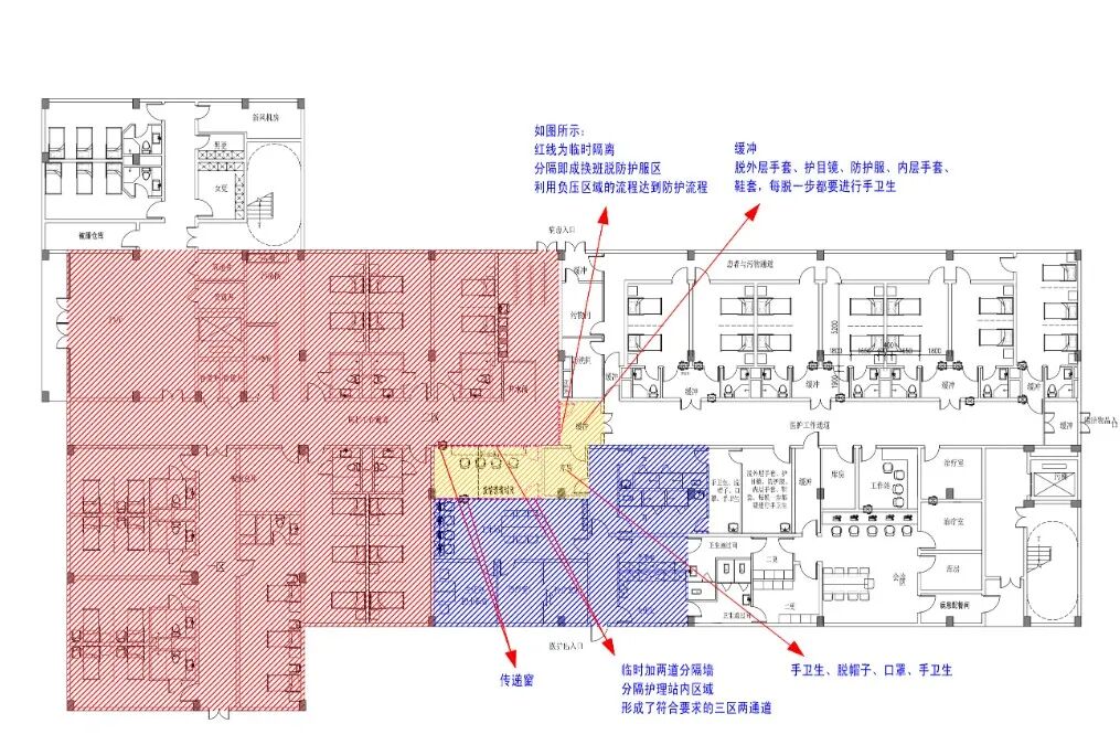 (5)在护士长办公室、SPD及污物间的墙上各开一扇门,平时关闭。可改为三区两通道时作脱防护服等的房间。