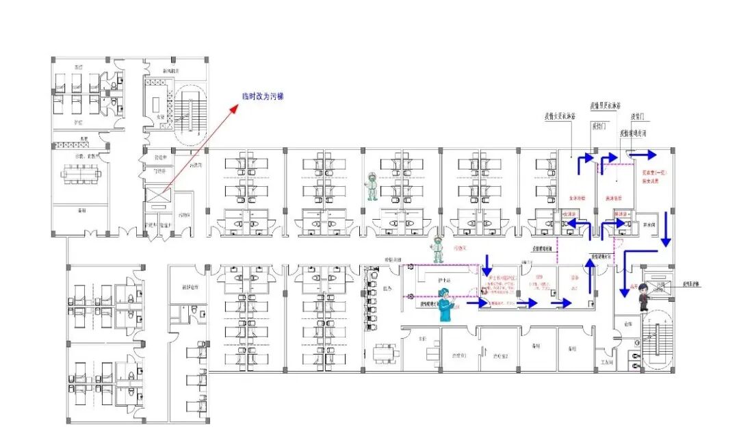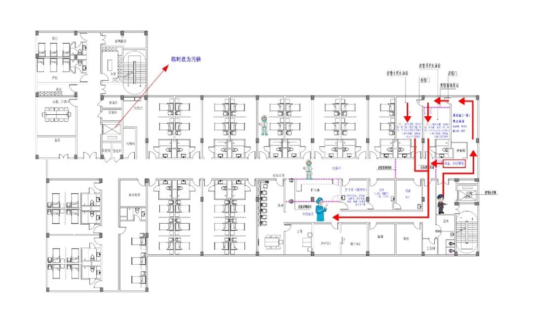 (2)临时改东面的洁梯为污梯(患者及污物通道实现“平疫”快速转化,平时服务,疫时抗疫,避免闲置),原污物电梯消毒后改为医务人员出入及清洁物品供应的洁梯。