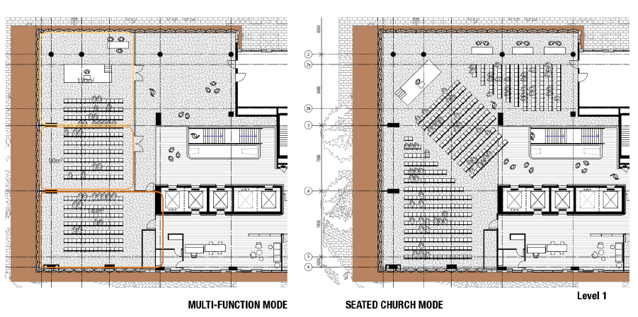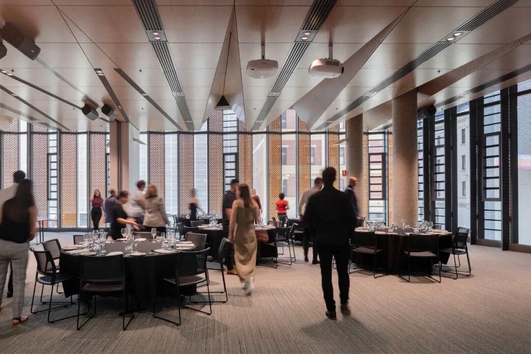 建筑低层空间聚焦商务办公,涵盖一个多功能跨层活动空间、Uniting Communities 社区服务中心及办公总部和一个 2 层的综合办公空间。1 到 2 层的多功能跨层活动空间,通过精心设计的天花、通透的大面积玻璃立面带来高端、优雅的氛围,可移动隔板则可以实现不同形式和规模的活动布置,供社区成员或公众进行教堂礼拜、商务会议、商业聚会等,灵活而弹性。
