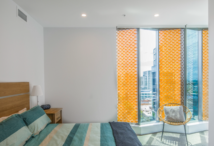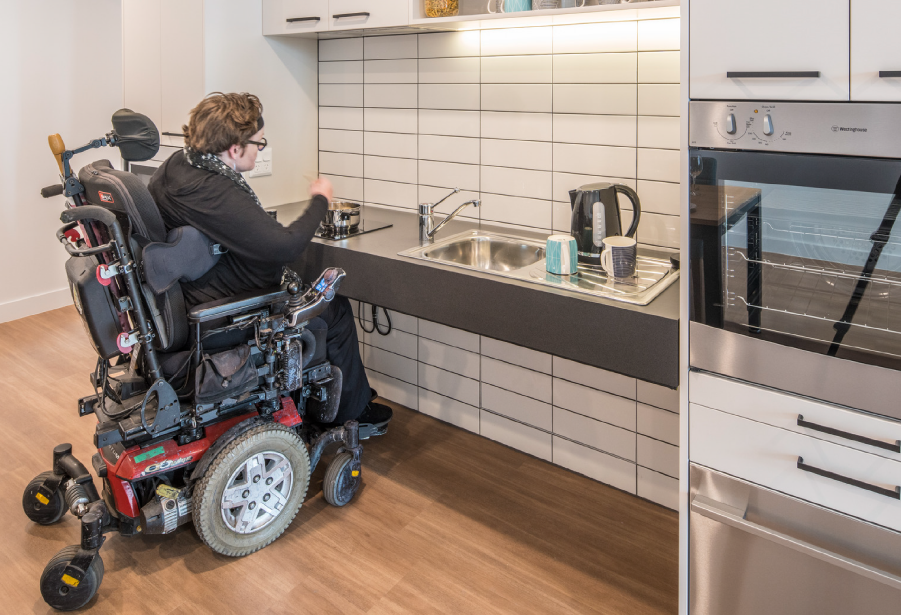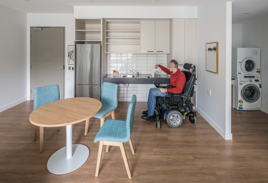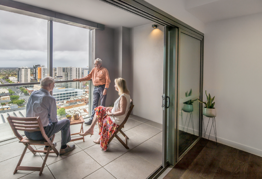 U City 作为阿德莱德第一个专为老龄人口及残障人士设计的健康社区,建筑物高层从 8 层到 18层按照不同住户的需求特别设计三种类型共 80 间公寓:41 间独立公寓、21 间残障人士公寓、18 间特殊需求人士短、长期休养度假公寓,供使用者按需选择。不同类型的公寓除高品质完备的一般性室内设施之外,还有根据具体需要加入科技元素,设计无接触式自动门、可调节高度的餐桌及无障碍卫生设施等。