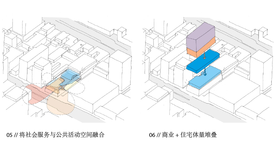 高密的城市肌理、使用者和空间需求的混合和多样都决定了整个设计的复杂性,因而团队将设计的重点放在如何在有限的基地条件下整合布局不同的功能板块。在综合考量结构合理性、材料选择、场地限制等因素和每个功能空间不同的功能需求基础上,团队由下而上通过体量堆叠的方式高效布局各功能区域,公共空间到私人空间自然过渡,精心融入 20 层高的高密度楼宇内,打造出一个兼具包容性和公众参与性的垂直健康社区。